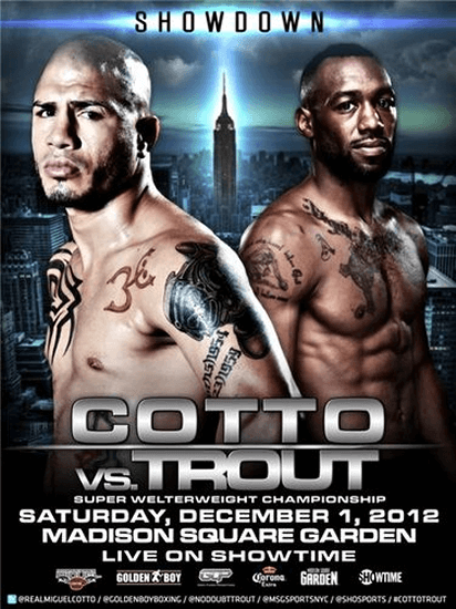 On Saturday, December 1st, 2012, Madison Square Garden in New York City was the stage for a high-stakes match between Miguel Cotto and Austin Trout. The event was promoted by MC Promotions, SMS Promotions, and Golden Boy Promotions, while Showtime Sports provided the broadcast coverage. The WBA World Super-welterweight Title was on the line, with Trout making his fourth defense of the belt.
