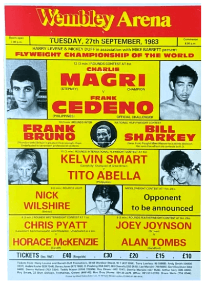 On Tuesday 27th September 1983, at the Wembley Arena in London, Charlie Magri and Frank Cedeno faced off in a highly anticipated WBC World Flyweight title bout. Promoters Mickey Duff, Mike Barrett, and Harry Levene were behind the event, which was aired on the BBC.