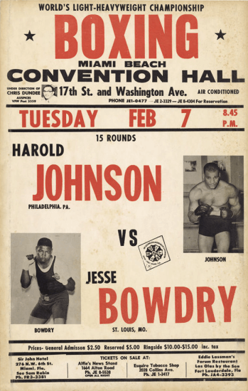 On February 7, 1961, Harold Johnson and Jesse Bowdry clashed at the Convention Center in Miami Beach, Florida, to determine the successor to Archie Moore's vacated NBA World Light-Heavyweight Title. The bout, promoted by Chris Dundee, drew a crowd of 4,017 and generated a gate of $20,829.50. Johnson entered the ring as the 3-1 betting favourite, weighing in at 172 pounds against Bowdry's 173. Both fighters sought to claim the belt left vacant after Moore was stripped for failing to defend within the required six-month period.