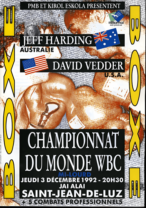 On December 3, 1992, Jeff Harding defended his WBC World Light Heavyweight Title for the second time in his second reign against David Vedder at the Salle Franklin in Saint-Jean-de-Luz, France. Harding entered the ring with a record of 22 wins and a single loss, while Vedder came in at 15 wins, 10 losses, and 3 draws. Harding, weighing 170¾ lbs, and Vedder, slightly lighter at 169¾ lbs, were officiated by veteran referee Arthur Mercante.