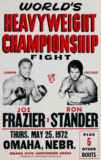 On May 25, 1972, Joe Frazier defended his World Boxing Council and World Boxing Association Heavyweight Titles against Ron Stander in a fiercely contested battle at the Civic Auditorium in Omaha, Nebraska. Both fighters weighed 218 pounds, but a formidable champion, Frazier, entered the ring as the overwhelming 10 to 1 favourite.