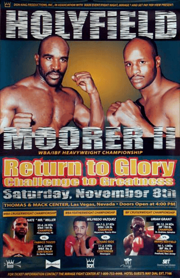 In a highly anticipated rematch, Evander Holyfield successfully defended his WBA and won Moorer's IBF belt at the Thomas & Mack Center in Las Vegas, Nevada. The fight culminated in a referee technical decision (RTD) at the end of the eighth round on November 8, 1997. The battle, which promised much due to the fighters' previous encounter, was absorbing, captivating and entertained the 13,200 fans present.