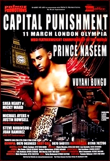 On Saturday, March 11, 2000, Naseem Hamed took on Vuyani Bungu in a fight held at Olympia, Kensington, London, England. The bout, billed as "Capital Punishment," was promoted by Matchroom Boxing & Cedric Kushner Productions and contested for the WBO and Lineal featherweight championships. Hamed, hailing from Sheffield, England, entered the fight with an undefeated record of 33-0-0, while Bungu, from Mdantsane, Eastern Cape, South Africa, held a record of 37-2-0. Both fighters weighed in under the featherweight limit, with Hamed at 126 lbs and Bungu at 125½ lbs.
