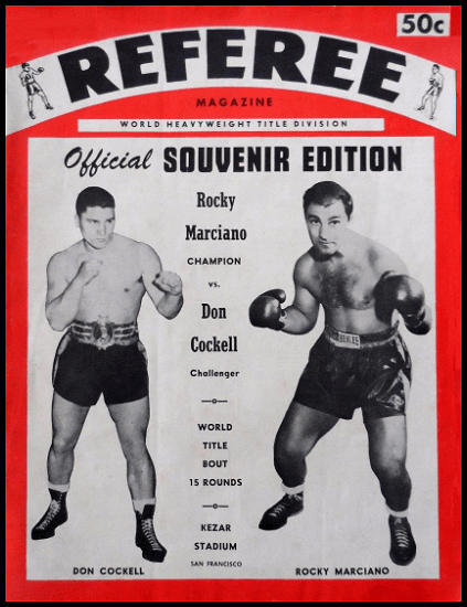 On May 16, 1955, the Kezar Stadium in San Francisco was abuzz with an attendance of 18,000 as undefeated Heavyweight Champion, Rocky Marciano, put his title on the line for the fifth time, this time against Britain's Don Cockell. The bout was broadly available through closed-circuit television, reaching 83 theaters in 59 cities. Marciano, the Brockton native, came in lighter at 189 lbs compared to Cockell's 205 lbs, despite having a superior record of 47-0-0 as compared to Cockell's 66-11-1.