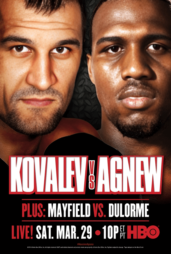 The second defence of Sergey Kovalev's WBO light heavyweight title at Atlantic City's Boardwalk Hall Ballroom on March 29, 2014, revealed new dimensions to the champion's skillset while maintaining his knockout streak. The previously undefeated Cedric Agnew (26-1, 13 KOs) forced Kovalev into his most extended fight since 2010 before succumbing to body shots at 0:58 of round seven.