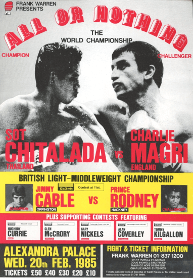 On Wednesday night, February 20, 1985, Alexandra Palace in North London staged a rare sight in British boxing, a reigning world flyweight champion defending his title on British soil. Sot Chitalada, the young Thai who had only recently taken the WBC and Ring championship from quality Mexican, Gabriel Bernal, met Charlie Magri, a former holder of the same belt and a seasoned London campaigner, in a bout promoted by Frank Warren and shown live on ITV. Both men had made the 112-pound limit without fuss. The contrast was plain enough before a punch was thrown, Magri the hardened, compact aggressor with years of fighting behind him, Chitalada the longer, fresher champion still being described, even by those close to the event, as a man learning quickly in only his ninth “international style” contest.